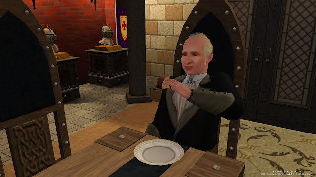 管家是一位世家伯爵,偶爾會到騎士廳用餐跟年輕的騎士守衛聊聊天。